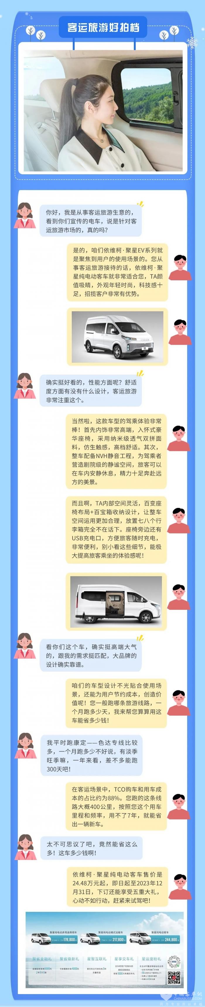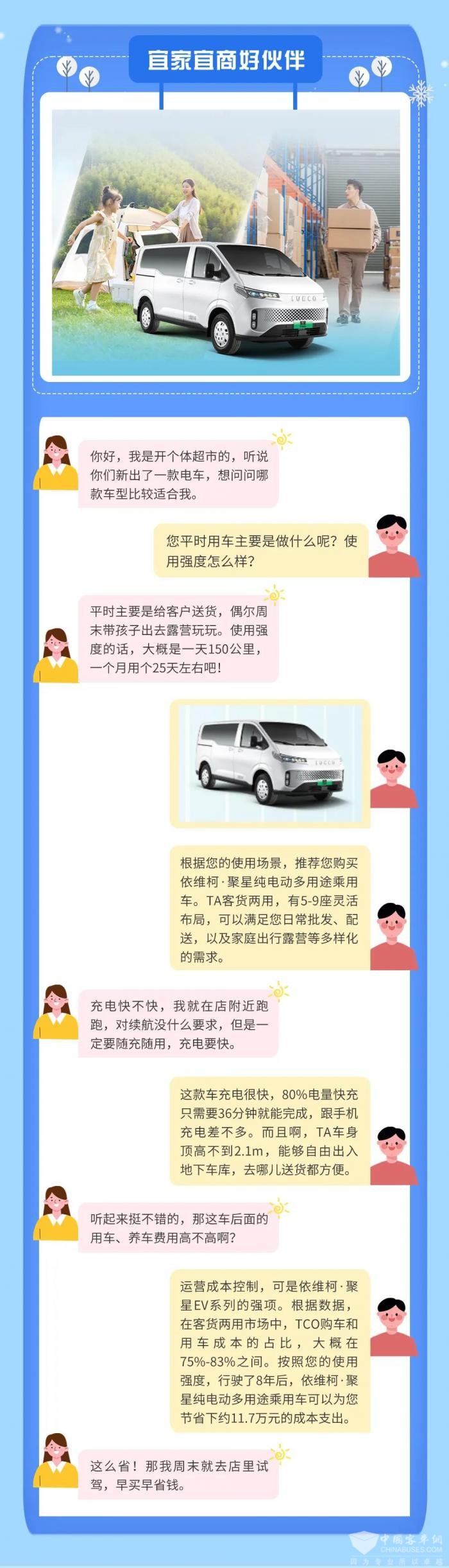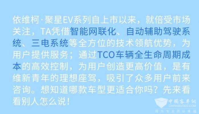 依维柯·聚星EV系列自上市以来,就倍受市场关注,TA凭借智能网联化、自动辅助驾驶系统、三电系统等全方位的技术领航优势,为用户提供服务;通过TCO车辆全生命周期成本的高效控制,为用户创造更高价值,是有维新青年的理想座驾,吸引了众多用户前来咨询。