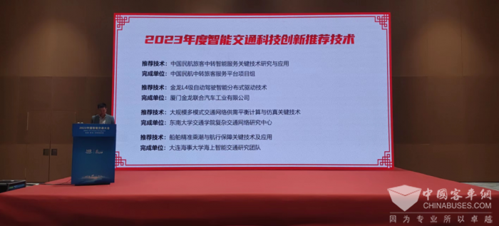 值得一提的是,金龙L4级自动驾驶智能分布式驱动技术在本次大会中的众多参评项目里脱颖而出,入选“2023年度智能交通科技创新推荐技术”。而不久前,金龙的L4级6601G自动驾驶微循环公交客车还在2023迪拜自动驾驶运输世界挑战赛上斩获桂冠。这是对金龙过去在自动驾驶领域的认可和肯定,更是鼓励与鞭策。