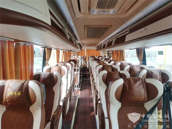 “由于周期长,游客要长时间待在车上,所以座椅很关键。我们这次从苏州金龙厂家定的这批车辆,就要求一定要把车内舒适性做好,尤其是座椅、空调等。”温智兵介绍道,“为了让乘客尽量坐得舒适,我们选择了软包航空座椅,而且采用了2+1的座椅布局,11米的车34座,右侧是单排、左侧是双排座椅,非常舒适。”