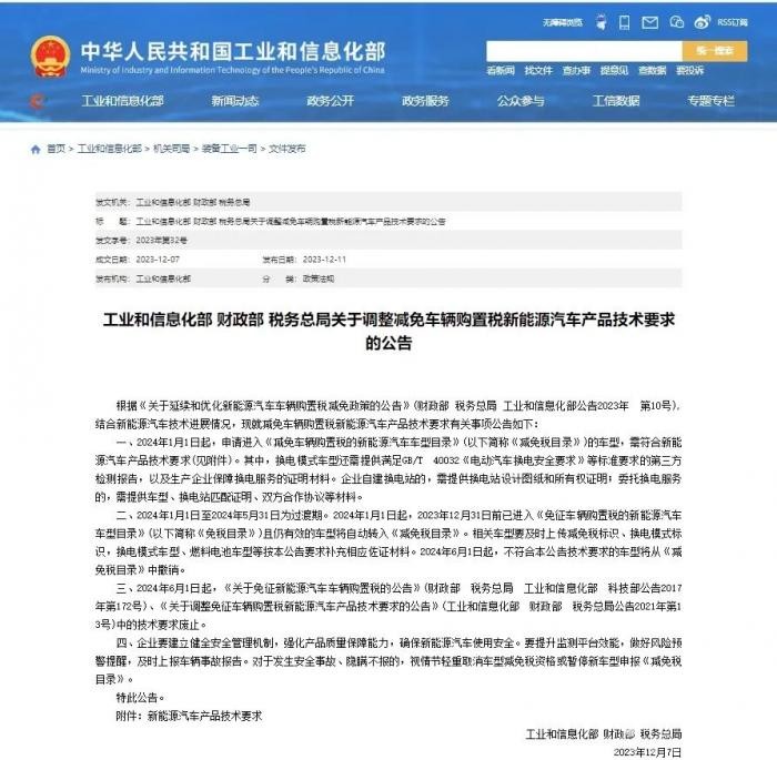2023年12月11日,工业和信息化部、财政部、税务总局三部门联合发布《关于调整减免车辆购置税新能源汽车产品技术要求的公告》(以下简称《技术要求公告》),明确了2024年后新能源汽车减免车辆购置税政策适用的技术要求、过渡期政策,并更新了相关标准和企业要求,也再一次将新能源技术的准入门槛进一步提高。