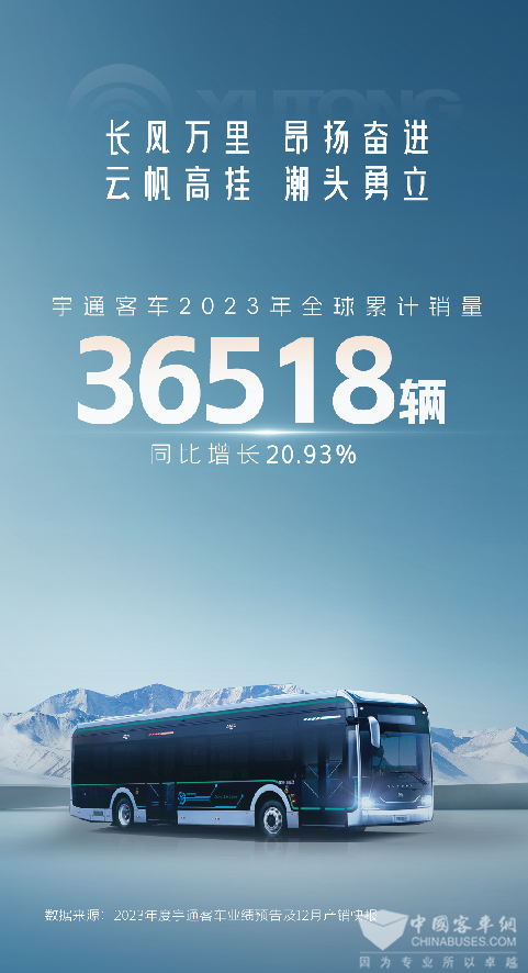 2024年1月11日,宇通客车公布2023年度销量成绩,全球累计销量达36518辆,同比增长20.93%,同时回顾了2023年的发展与荣誉。