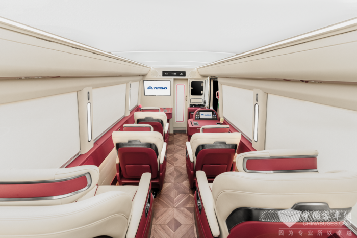 凝聚中国美学设计理念的内饰精致大气,T7“新春鸿运版”细节处理无不深藏惊艳。走进内饰,感受视觉上的享受,一切舒心惬意油然而生。各种功能配置应有尽有,顶部搭载A380同款空客顶灯,支持3种颜色变换调节,营造通透明亮的视觉效果;前方配备全新皮革包覆的办公桌和秘书桌,水杯架、抽纸盒、220V电源和无线充电等细节设施都贴心配备,舒享从容办公;搭配32英寸可投屏电视、电动窗帘、实木地板以及冰箱酒柜等设施,极致细节礼遇,尽显王者风范。