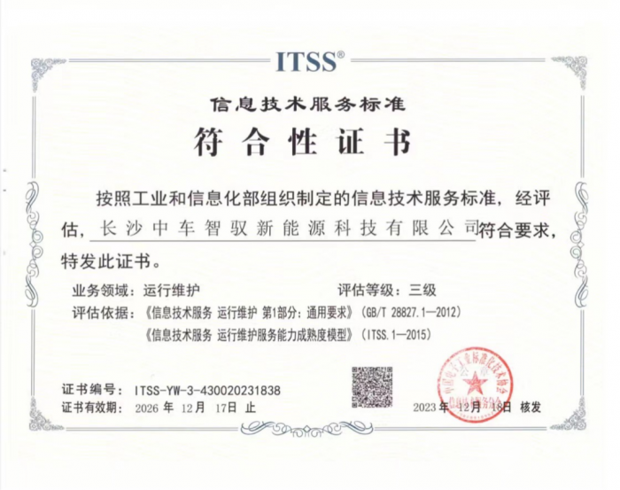 经严格评估和审核,2023年12月,中车电动旗下的长沙中车智驭新能源科技有限公司(简称:智驭公司)成功获得两项“国家级”IT资质:ITSS信息技术服务标准认证、双软资质。标志着智驭公司在信息技术服务领域的专业技术和服务水平得到“国家级”认可。