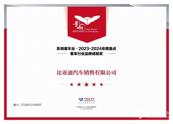 在近日举行的第十八届影响客车业年度盘点颁奖典礼现场,比亚迪商用车凭借在2023年的优异表现,成功斩获了2023-2024年度“客车行业品牌成就奖”。比亚迪再次蝉联这一客车领域影响力极强的大奖,充分展现了其在商用车领域的影响力和突出贡献。