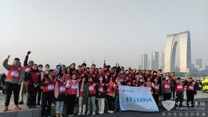 本届马拉松赛,苏州金龙组织49人的志愿服务团队参与服务,总计服务时长超420小时。
