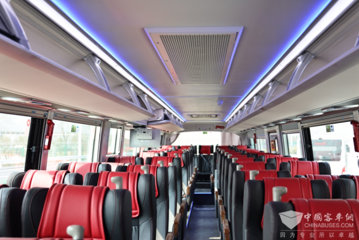 倾斜式风挡+全承载车身,降低车辆阻力,多重降耗技术更节油,为高效加分。座位数达到55+1,空间利用率高。双边豪华行李架美观实用,地板、穹顶、仪表台的氛围灯组与可选多色可变星空顶,让旅途更加惬意,为舒适加分。