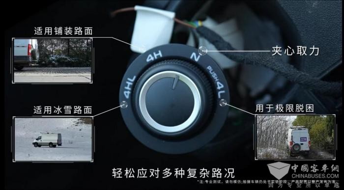 在冰雪路面行驶,拥有一套出色的四驱系统不仅可以保证车辆的稳定性,还能提高驾驶的安全性,作为越野车的核心装备,四驱系统的选择往往起着决定性的关键作用。目前,市场上的高端越野车型多采用全时四驱,也就是圈内说的“真四驱”,这类车型的特点就是车辆无论何时都采用四驱模式,也就是说四个车轮在任何时间都是独立地进行驱动的,途径冰雪路面时,全时四驱会提供稳定的牵引力,驾驶者只需按照正常的行驶方式使用就可以了。比如,依维柯欧胜4X4采用的就是军标级全时四驱分动器,有4个档位,其中4HL档就是适用于冰雪路面的驱动模式,中央差速锁可根据路况在行车过程中自由切换,行驶车速不受限,最高车速可达140km/h,高速四驱和低速四驱均可使用,充分满足越野玩家与普通车主的不同需求。