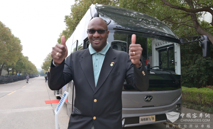 在参观展车环节,驻华使节还纷纷登上苏州金龙面对全球市场研发的新V系智慧客车,感受了现代化客车的舒适驾乘体验并频频点赞。格林纳达驻华大使马岩表示,很荣幸能来到海格,了解到更多关于产品、技术进步以及海格的未来规划。他还特意用汉语表示,在格林纳达目前只有苏州金龙的传统动力车型,这次参观苏州金龙感觉新能源车型非常好。