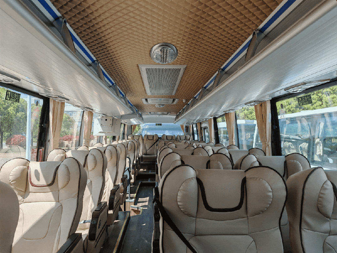 车内整体采用梅拉德色系,深木色搭配奶白色,顶板菱形软包,为乘客营造家一般的“松弛感”,为每一次出游提高乘车视觉舒适度。车厢内高超过1.9米,乘客车内过道通过舒适,头部空间更大。