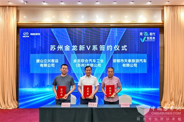 出色的产品和贴心的服务,给予了客户极大的信心。活动现场,苏州金龙河北销售部经理陈永强分别与唐山立兴客运有限公司总经理王金立、邯郸市天泰旅游汽车有限公司总经理周斌签约新V系批量订单。