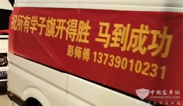 高考前一夜,多辆身披高考助威横幅的图雅诺轻客已经准备就绪。一辆辆车整齐停放在街头,车身上,醒目的“祝所有学子旗开得胜,马到成功”祝福语,在夜色的映衬下熠熠生辉。值得注意是,每一辆车都贴心地标注了司机师傅和电话,以便为距离考点较远或有特殊需求的考生,提供一对一预约接送服务。