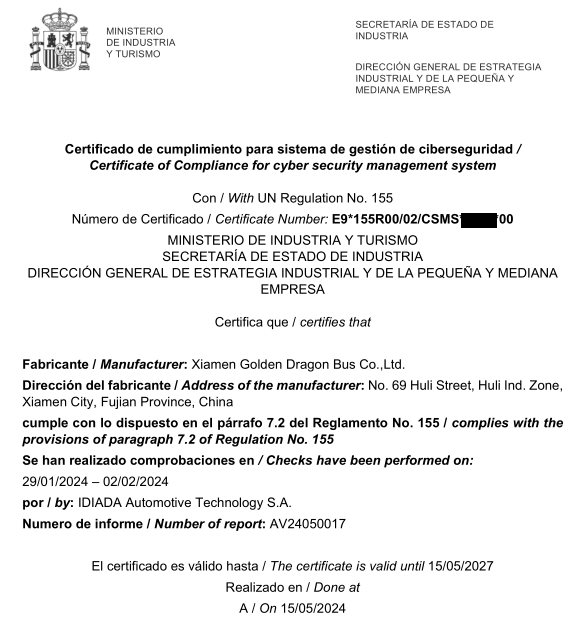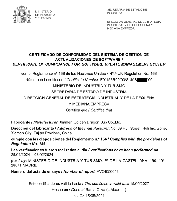证书由权威机构西班牙工业、贸易和旅游部颁发,不仅表明金旅已在产品全生命周期内建立起符合国际法规要求的网络安全与软件更新能力,也为金旅在智能网联汽车领域的技术创新和加速“出海”步伐奠定了基础。