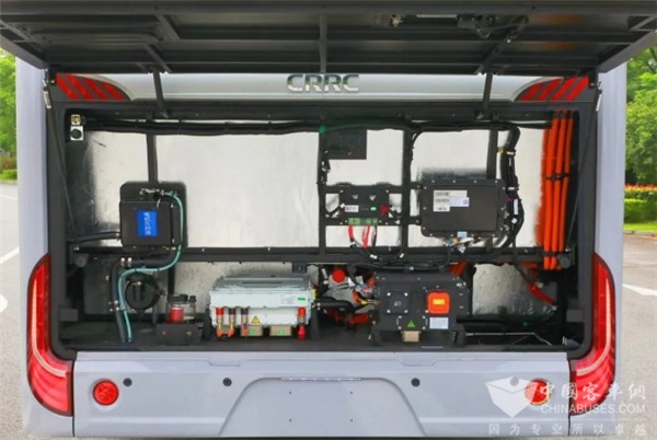 动力系统搭载了中车自研的轮边电机及集成SIC技术的TP6控制总成,实现了电机与控制器的高度集成。与传统的四合一总成+两独立电机控制器+电子差速控制器方案相比,提高了系统的可靠性,系统重量降低50KG以上,效率提升2%,系统集成度行业领先。