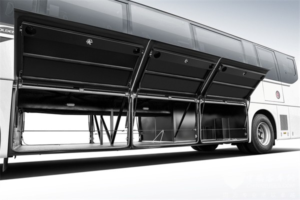 在造型方面,凯旋以对原有成熟产品的延续为主,而在功能和性能方面则聚焦在升级。例如,在旅游客运用户关注的行李舱容积方面,通过搭载最新电池箱获得更大的空间,并采用贯通式设计,最大容积可达到7m³。行李舱门采用单轴铰链设计,最大开启角度大于135°,在拿取行李时更加方便安全快捷,有效提升了客运效率。张纲说,行李舱门打开角度加大看上去似乎很简单,但涉及到成本、工艺、密封性、强度、等诸多因素影响,只有同时兼顾好这些因素,打开角度才能实现有效加大。