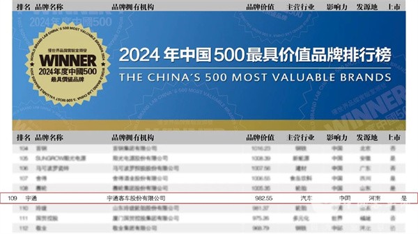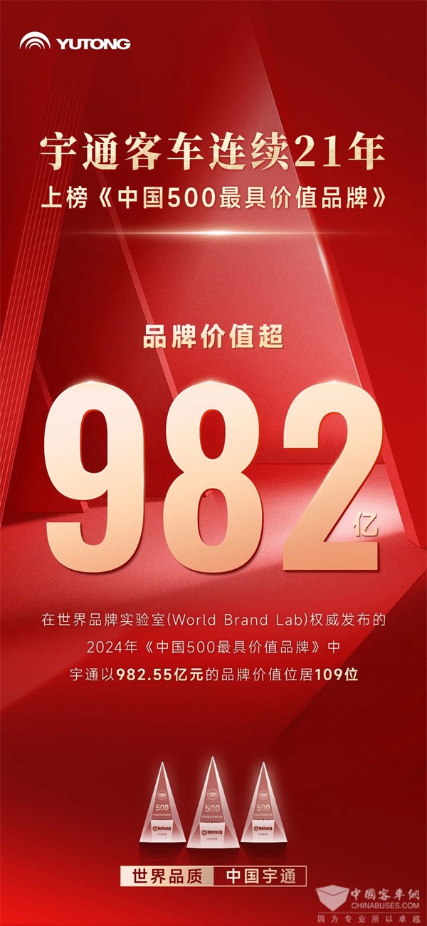 2024年6月19日,2024年(第21届)“世界品牌大会暨中国500最具价值品牌发布会”在北京举行,会上发布了2024年《中国500最具价值品牌》排行榜。宇通以982.55亿元的品牌价值实现再一次的跃升。