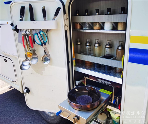 孙女士:“我平时很喜欢做饭,所以对厨房的布置比较多。房车的厨房设计合理,空间大,能放很多东西。而且,我这台车是依维柯底盘配空气悬架的,车子的超高稳定性让烹饪过程更加平稳,即使是在颠簸的旅途中也能安心制作美食。”