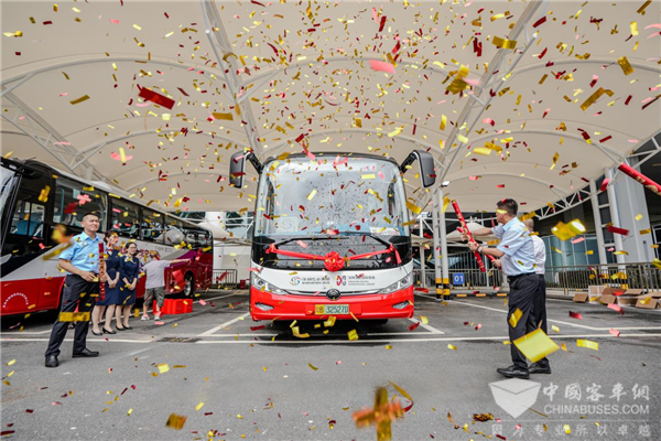 在首辆宇通高端新能源客车首发头车从深圳发车的同时,中山会场内早已准备就绪的宇通高端新能源领航头车也开启了同步始发之旅,在万众瞩目下,宇通高端新能源客车创下了线路通车首日即完成对向发车的纪录。