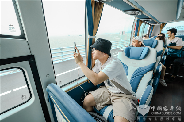 在开通仪式上,由各部委单位、各行业领袖、社会人士组建的首航体验团也乘坐宇通高端新能源客车,感受着“世纪工程+高端巴士”双重BUFF叠加所带来的全新出行体验。作为该线路的首航承运者,宇通C11E 2+1座椅青山碧水款给乘客增添了一番“享受”与别样的出行体验,收获了“陆上商务舱”、“高端出行标杆”等赞誉。