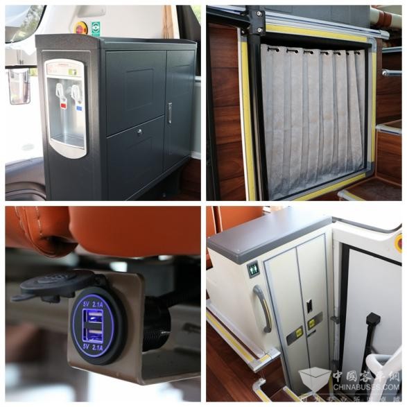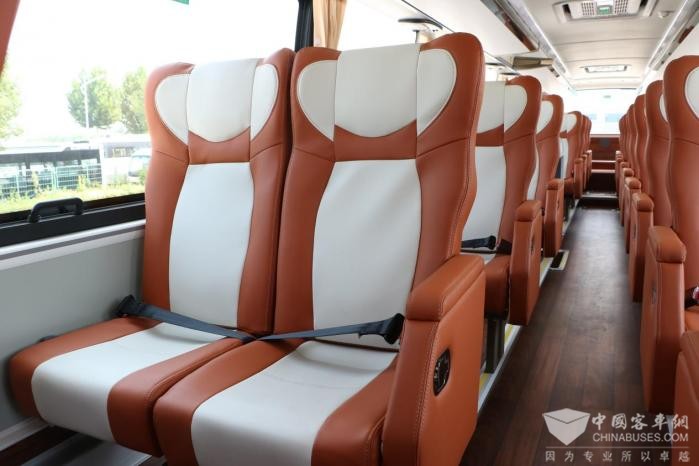为满足线路的高品质运营需求,该批车辆座椅全部采用航空商务座椅,座椅间距平均达1.04米,真正做到了可坐又可卧。同时,车内配备了卫生间、USB充电口、饮水机等便捷生活设施,配备9.5m³超大行李舱。考虑到长途旅行驾驶员的休息需求,车辆设置驾驶员前置休息舱,舱内配备空调、暖风,保障不同时节的舒适性。