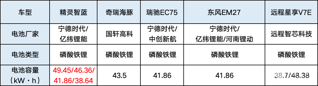 宁德时代电池是目前业界公认的优秀产品,其成本也相对高一些,安全性好、续航长、效率高、即使卖二手车,买家也更愿意要宁德时代的产品。5款车型中,仅有精灵智蓝、瑞驰EC75、东风EM27采用了宁德时代的电池,而电池容量最高的则是精灵智蓝。