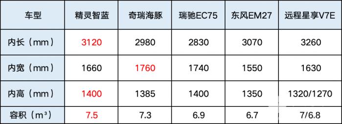 这里顺便提一句,车身尺寸方面5款车有大有小,但在同样的载货容积下,我们并不能认为越大越好,因为物流型车需要走街串巷,比如某些路段会有限宽,或某些地库会有限高,这都是影响运输效率关键指标。因此,我们需要同时关注货厢尺寸和容积,比如同容积下尺寸越小,就越有竞争力。