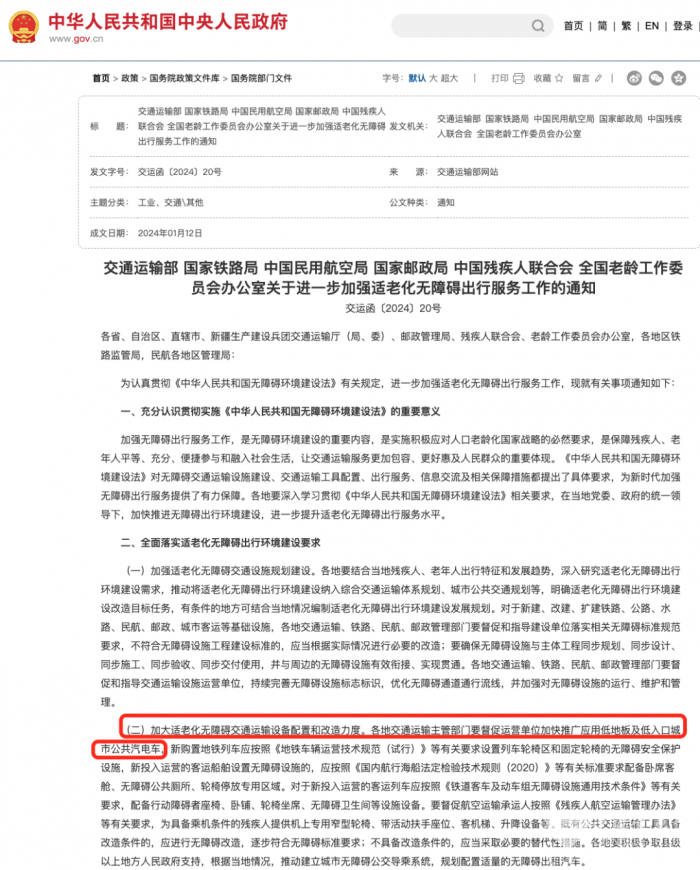 2024年初,交通运输部等六部门发布《关于进一步加强适老化无障碍出行服务工作的通知》,其中提出,加大适老化无障碍交通运输设备配置和改造力度,各地交通运输主管部门要督促运营单位加快推广应用低地板及低入口城市公共汽电车。