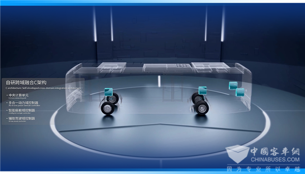 “一云两舱”智慧方案,正是宇通多年创新研发实力的集中体现。该方案以宇通自主研发的国内商用车行业首个域融合集中式电子电气架构——C架构为技术基石,从运营管理优化、场景需求匹配、驾乘体验升级三大维度入手,为用户量身打造最优车联网解决方案。
