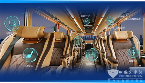 智享客舱则精心打造视觉、触觉、听觉、嗅觉、温觉五感盛宴,融合全景视听、信息交互等智能科技,辅以电动化舒享座椅与智能空调,全面升级客舱品质,让乘客尽享“五感交融,愉悦旅程”。尤为亮眼的是,宇通行业首创智能投屏系统,不仅丰富了乘客的旅途娱乐互动,更为车辆商业应用开启了新篇章,如景点介绍、直播带货等。