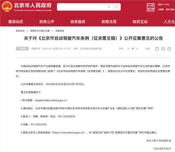 2024年6月,北京市经信局发布《北京市自动驾驶汽车条例(征求意见稿)》公开征集意见,北京市拟支持自动驾驶汽车用于城市公共电汽车客运、网约车、汽车租赁等城市出行服务。《条例》的发布,标志着北京自动驾驶汽车上路将迎来立法保障,为自动驾驶技术的研发和应用提供了更加稳定和可预期的政策环境。