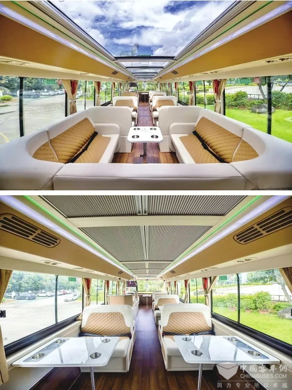 为更好入城市特色、让乘客沉浸式体验当地的风土人情,该款观光双层巴士内饰还可定制刺绣图案,展示历史文化和非物质文化遗产等。此外,观光双层巴士内还安装了环形七彩氛围灯和点歌系统,可以变为移动的娱乐空间,让乘客的旅途更精彩、有趣。