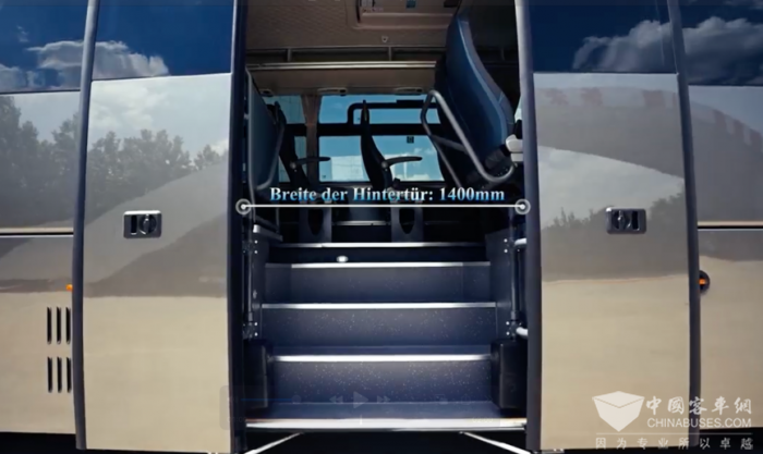车门方面,前车门与后车门均采用塞拉门设计,既安全又方便,高峰期通过性好。前车门的踏步高度为360mm,方便所有人的上下车,后车门开启宽度为1400mm,上下车的空间极为宽敞,体现出同级车型少有的空间感。
