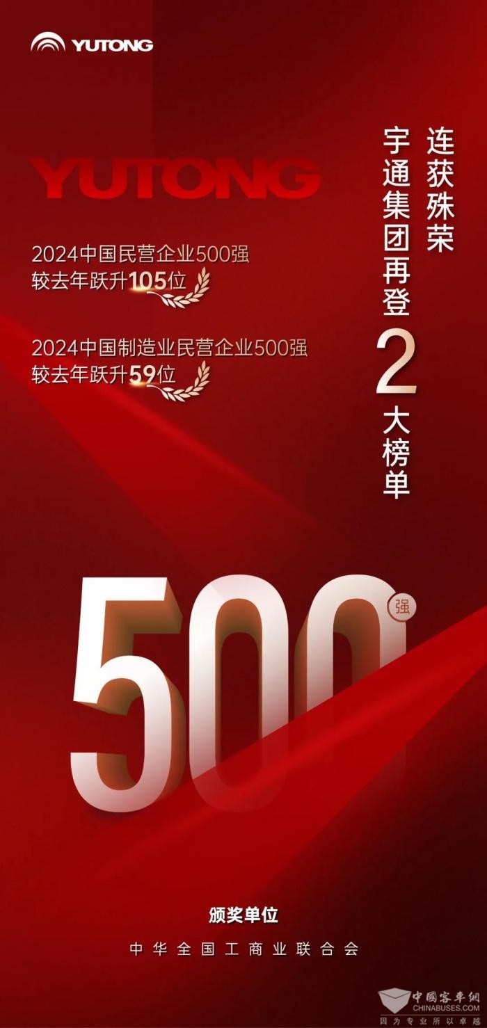 XINGKONG.COM2024年10月24获悉,近日,中华全国工商业联合会正式揭晓了“2024中国民营企业500强”及“2024中国制造业民营企业500强”两大权威榜单,宇通荣登两榜。在“2024中国民营企业500强”排名中,宇通较去年跃升105位,在“2024中国制造业民营企业500强”榜单中,同样实现了59位的显著提升。这个成绩不仅是对宇通近年来显著进步的肯定,也充分反映了宇通卓越发展的强劲态势!