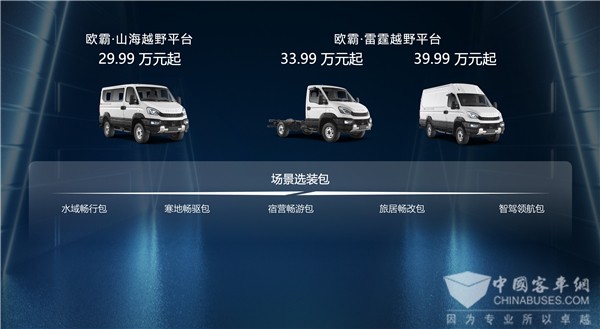 2024年11月15日,山海雷霆,越野越行——依维柯新品发布会在广州车展期间期间举行。会上,依维柯4X4系列产品正式发售,其中欧霸·山海越野平台,售价29.99万元起;欧霸·雷霆越野平台,售价33.99万元起。同时,还推出了水域畅行包、寒地畅驱包、宿营畅游包、旅居畅改包、智驾领航包等多款定制选装包,为不同需求的用户提供更自由选择。