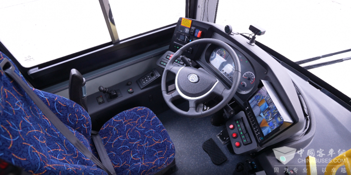 针对该批车辆运行线路长、路况复杂、驾驶员工作强度大等特点,在驾驶区设计上,重点放在了提升驾驶舒适性和安全性方面。驾驶门采用了磁吸式设计,开关更加方便;采用了空气减振座椅,并加大了座椅和方向盘之间的空间;仪表台和方向盘为悬浮式设计,不同体型的驾驶员可以根据自己的驾驶习惯灵活调整;配置了司机防疲劳驾驶监测,车道偏移预警系统,360全景环视系统,胎压监控系统等智能化配置,从而提升车辆的主动安全;采用带有ASR功能的电子制动系统,在保证制动安全的情况下,减少了频繁制动给车内乘客带来的冲击和顿挫感。