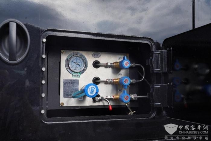 在保证燃气安全方面,一是采用了气瓶顶置方案,规避了因意外撞击导致的风险;二是将加气口与车辆的裙边间距增加到230mm,在发生侧面碰撞时,留有充足的缓冲距离;三是通过高低压、动静态检测手段,来确保每台车管路的密闭性;此外,这款车还安装了气体泄漏报警装置,从而做到防患于未然。