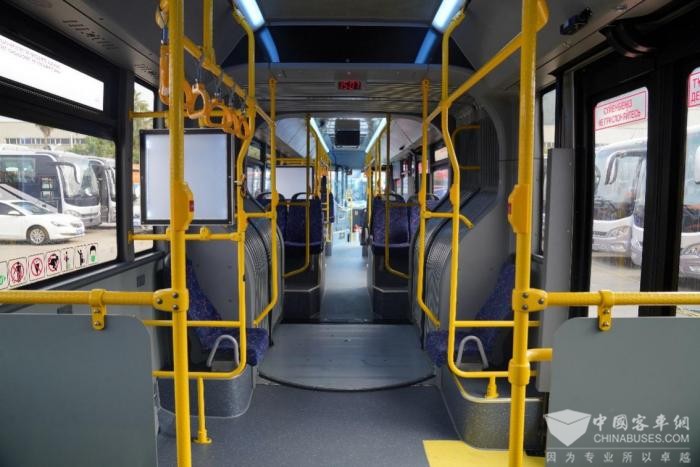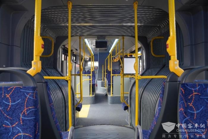 在车内布局方面,同样体现了金旅为满足海外客户个性化需求的定制化能力。为了提升乘坐体验,车辆配备车载WIFI系统,在所有座位处都配有USB充电接口;针对特殊乘客,车辆配备了残疾人乘车辅助坡板,可以让轮椅、婴儿车等方便上车;在为老年人专门设计的座椅区,增加了扶手和呼叫按钮,便于行动不便者下车;对第一节车厢的座椅和空间布局优化,在保证整体座位数的情况下,减少了左侧的一排座椅,增加了轮椅和婴儿车区域的地板空间,在客流高峰时,也会大幅提升乘客的站立区域。