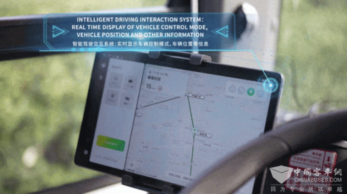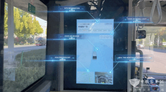 车内电子屏可实时显示车辆位置、站点距离、高精地图、交通信号灯等信息,车辆配备的高精感知定位设备,可精准识别站点和信号灯状态,实现车辆的安全停靠及智能通行。