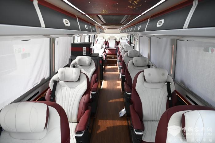 这款12米车采用了“15+1”的座椅排布,全部配置了带按摩通风和加热功能的航空座椅,不仅座椅间距宽敞,还可以调成零重力休息模式,即使最后一排也能实现“躺平式”休息,保证了每个乘客的乘坐舒适性。车辆内饰采用新中式的风格,营造出一种日出东方的意境,喷绘也非常精致,加上苏绣工艺集成,星空和朝阳氛围灯加持,奢华感十足。