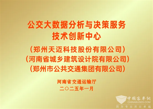 2025年1月17日,河南省交通运输科技创新会议召开,会议期间为2024年度河南省交通运输技术创新中心和重点实验室授牌。河南省交通厅授予以郑州天迈科技为依托单位,河南省城乡建筑设计院、郑州公交为参建单位的——公交大数据分析与决策服务的技术创新中心。