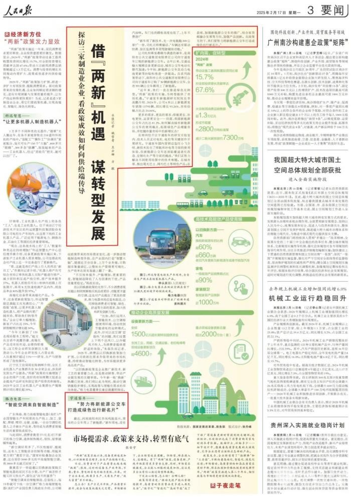 2025年2月17日,人民日报要闻版面综合报道“两新”政策落地实施成果,宇通客车作为汽车领域的唯一代表,以显著的成果展示了“两新”政策在推动行业绿色化转型方面起到的巨大作用。