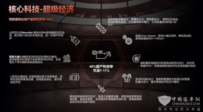 同时,非EGR设计和先进的热管理技术,使得发动机能够更好地适应不同品质的燃油,进一步提升了燃油经济性。此外,康明斯发动机的轻量化设计也提升了燃油经济性。发动机干重仅为796kg,比竞品轻3%,这不仅降低了整车重量,还减少了燃油消耗。对于客运企业来说,油耗的降低不仅降低了运营成本,还提升了车辆运营里程,助力用户高效运营。