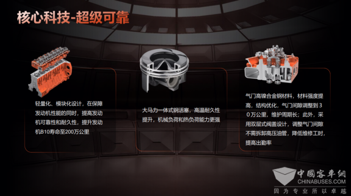 此外,发动机的模块化设计和轻量化材料应用,进一步提升了其可靠性和耐久性。对于客运企业来说,发动机的可靠性不仅降低了维护成本,还提高了车辆使用时间,确保了运营的连续性和稳定性。值得一提的是,后台联网支持预见性服务,发动机支持OTA远程升级,为车辆的高效运营提供了有力保障。