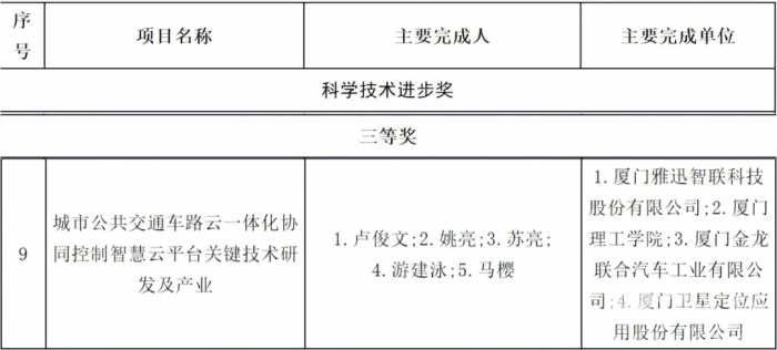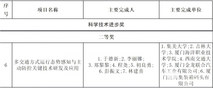 项目由厦门金龙联合汽车工业有限公司等八家不同领域的专家团队与示范单位企业、高校联合共创,近20年来以智能感知与信息处理技术为基础,围绕多交通方式运行效率和安全提升,以“态势感知—主动防控—集成推广”为主线,提出了数据驱动的核心装备状态感知与交通运行态势推演技术和多交通方式主动防控理论、模型和方法,成功自主研发具有自主知识产权的新一代面向多交通方式运行的态势感知与主动防控关键技术和应用,实现面向中国式现代化的安全、高效、经济的可持续交通体系,核心技术鉴定为国际先进水平。