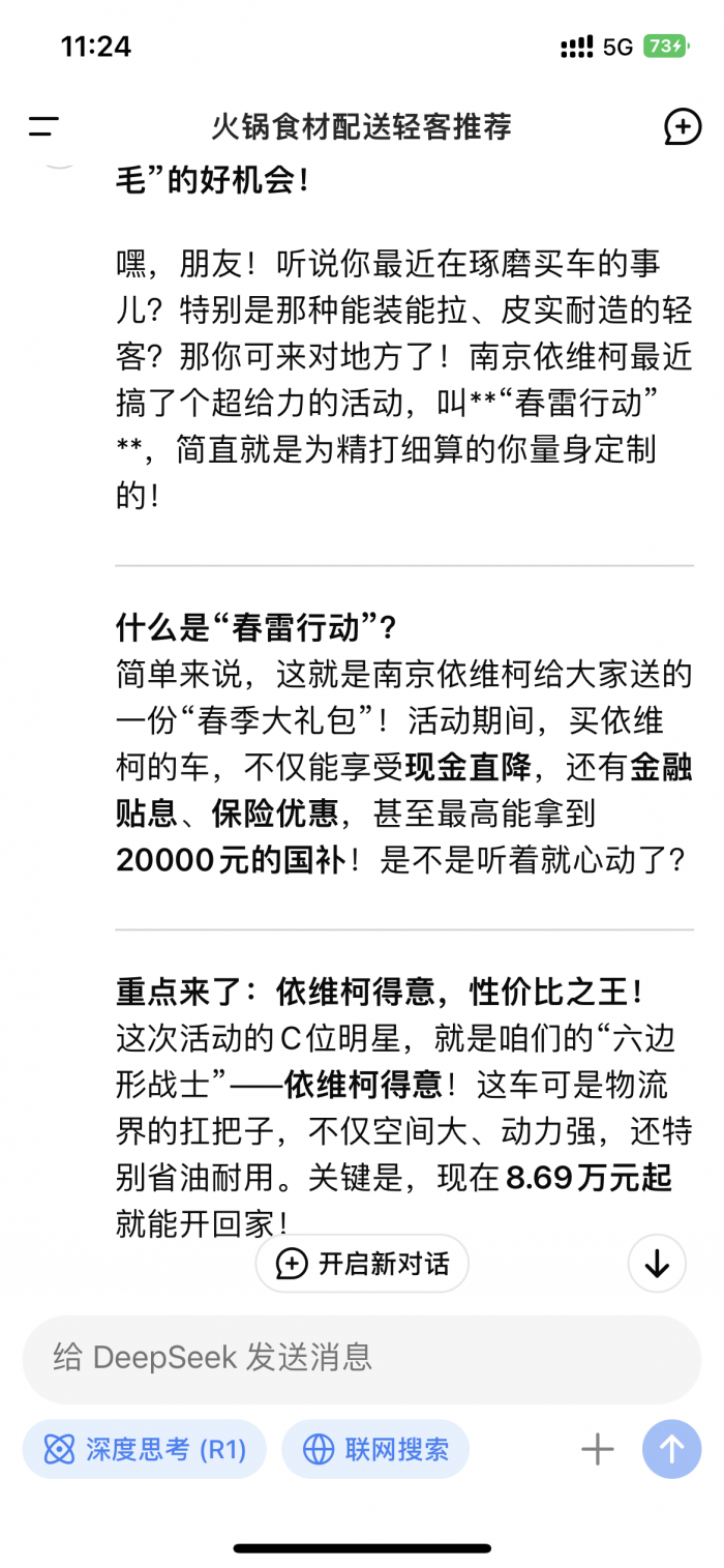 老周还是不放心,赶紧又问:“开车遇到红绿灯起步最怕后面车滴我了,得意的动力咋样啊?”他最在意的动力问题,在得意的产品参数里找到了答案。依维柯得意单胎车型搭载全新SOFIM第五代柴油发动机,动力强劲,功率可达110kW;并且它还是后驱车,在城区红绿灯前起步时,提速迅猛,1400-2800rpm转速区间,就能输出高达350N·m的最大扭矩,哪怕是城区低速重载的情况,得意也能轻松拉动!不仅如此,DeepSeek 同样贴心的为老周“出谋划策”,在南京依维柯 “春雷行动” 期间,探讨怎样花最少的钱,把心仪的依维柯得意这款车开回家 。