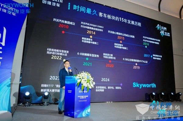 开沃集团常务副总裁董钊志先生发布了全新的商用车技术品牌SKYWORTH S+,拥有Safe安全、Synergy 协同、Specialized 定制、Smart 智能、Save Energy 节能共五大平台级优势。“S+”代表着AI时代全新进化的商用车技术理念,是服务于定制化战略的系统化技术集成。