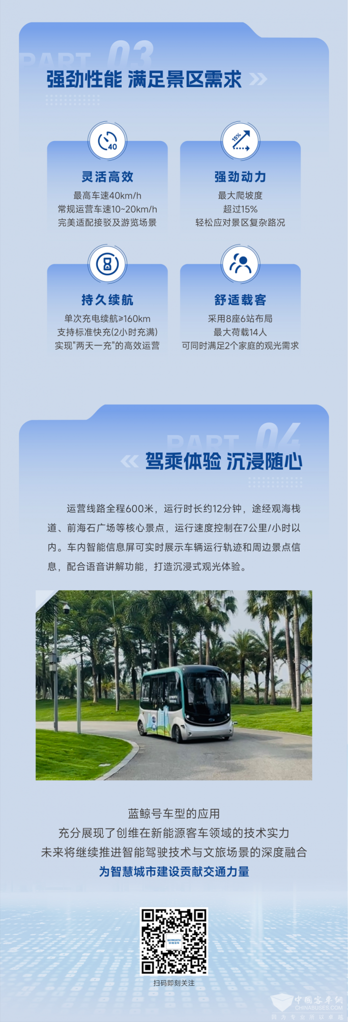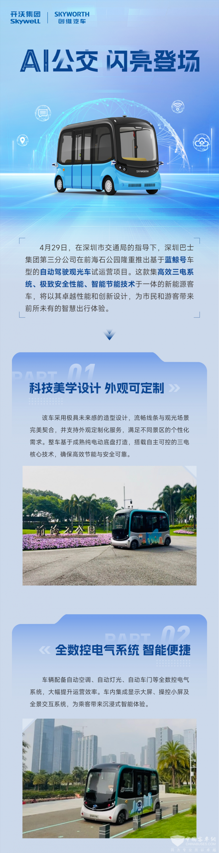 2025年4月29日,在深圳市交通局的指导下,深圳巴士集团第三分公司在前海石公园隆重推出基于蓝鲸号车型的自动驾驶观光车试运营项目。这款集高效三电系统、极致安全性能、智能节能技术于一体的新能源客车,将以其卓越性能和创新设计,为市民和游客带来前所未有的智慧出行体验。