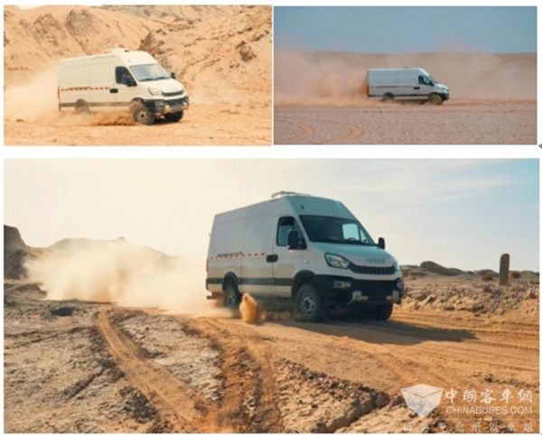 在松软的沙地,由于沙地无法提供足够坚实的支撑,车轮很难抓地,极易陷入沙中,常常出现空转现象,还可能因频繁摩擦颠簸造成零部件的损坏。然而,这些困难在依维柯欧霸·山海、欧霸·雷霆面前,并非不可克服。