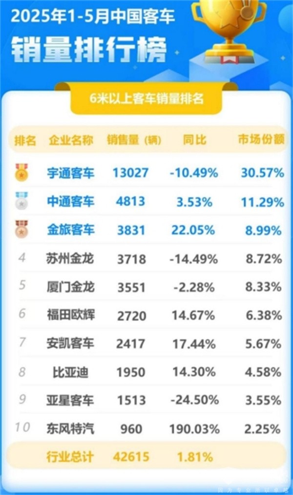 2025年前5月,宇通客车在6米以上客车市场持续保持领跑态势,累计销量达13027辆,以30.57%的市场份额稳居行业第一。尤为突出的是,其销量规模已超过行业第二、第三、第四名企业的销量总和,形成极具说服力的领先优势。这既是宇通品牌综合实力的印证,更是用户对其产品价值高度认可的生动注脚。
