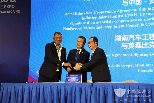 在中非职业教育合作对接活动中,刘凌代表中车电动与湖南汽车工程职业大学、莫桑比克公共交通运营公司共同介绍了非洲新能源人才培养模式,三方还签订了战略合作协议。