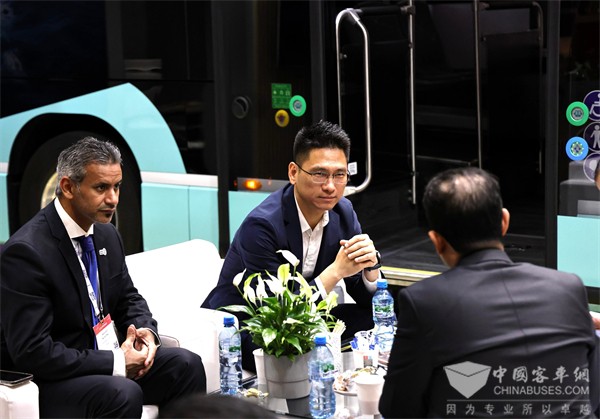 苏州金龙副总经理郑春辉(左二)与海外客户交流